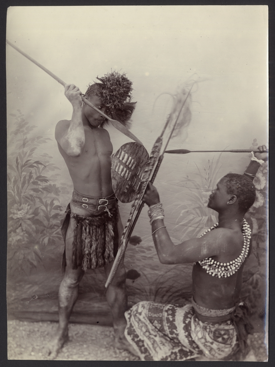 Denna ateljéfotografi föreställer två Zulu-krigare med traditionella kläder och vapen som låtsas strida inför fotokameran.