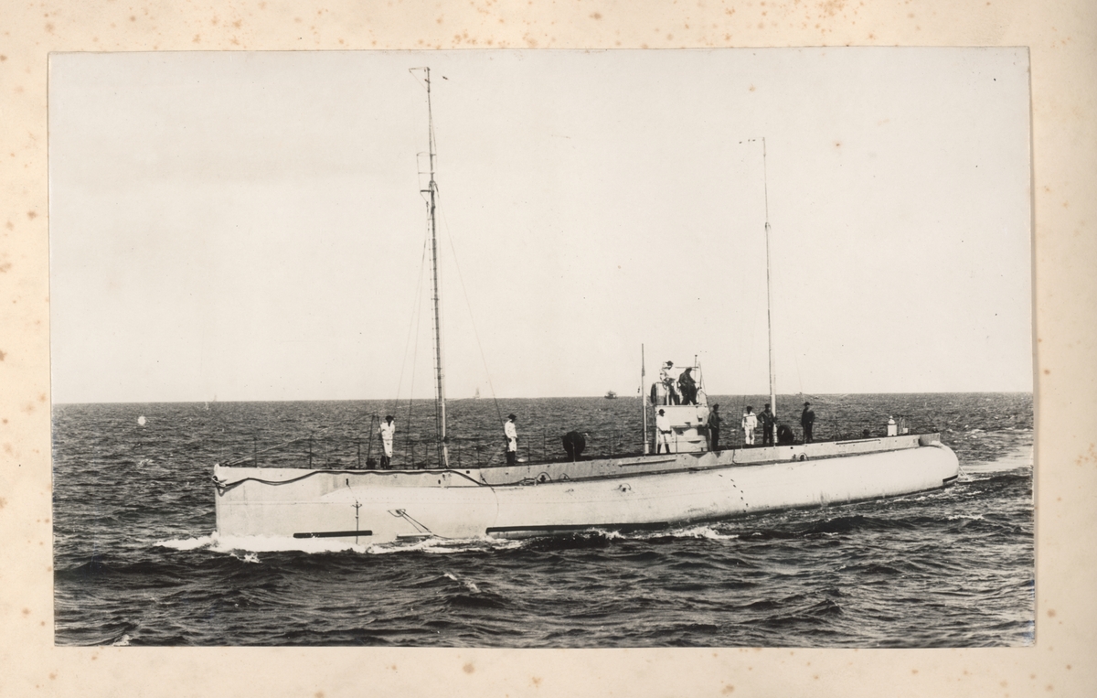 Bilden visar den tyska handelsubåten Deutschland tillhavs. En del av manskapet står på däck och på tornet.