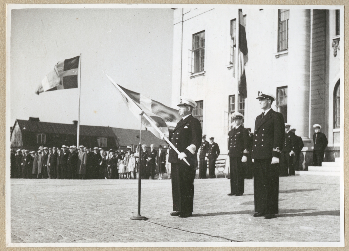 Konteramiral Ehrensvärd står på stortorget framför rådhuset i Karlskrona framför en mikrofon. I händerna håller han en stor Sverigeflagga. Bakom honom står en löjtnant och en kommendörkapten. I bakgrunden syns en folkmassa med blandade militärer och civila, samt fler flaggor.
