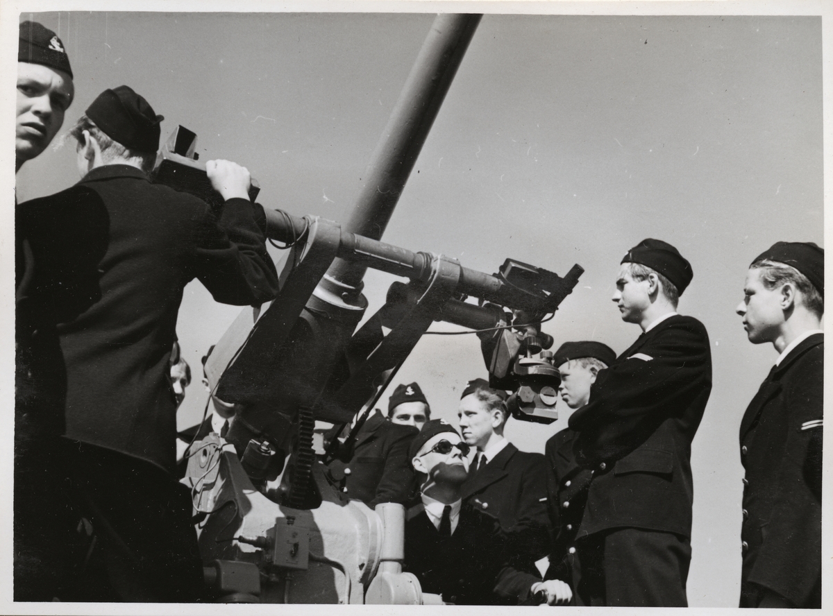 Bilden visar en grupp rekryter samlad runt en luftvärnskanon. Utbildaren sitter i stolen och siktar mot himmelen.