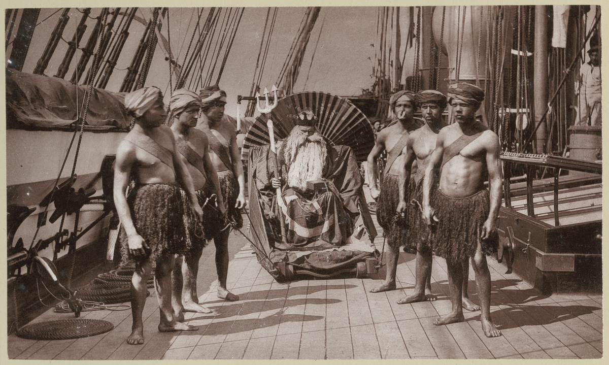 Bilden visar en scen ur linjedopet ombord på korvetten Stosch. Havsguden Neptun kommer ombord med sin hovstat.