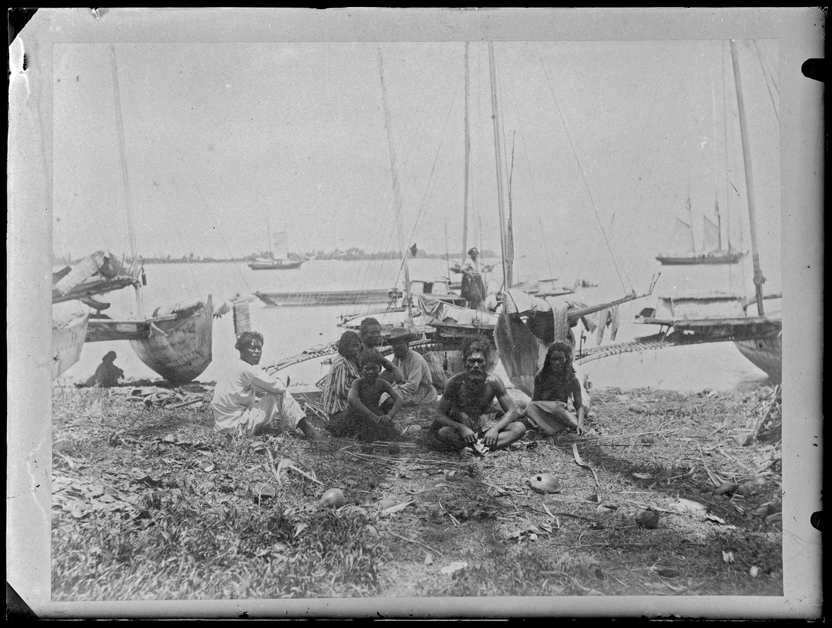 En grupp män och kvinnor från ursprungsbefolkningen på Jaluit sitter på stranden. Där ligger ett flertal utriggarkanoter och i bakgrunden pågår en livlig skeppstrafik.