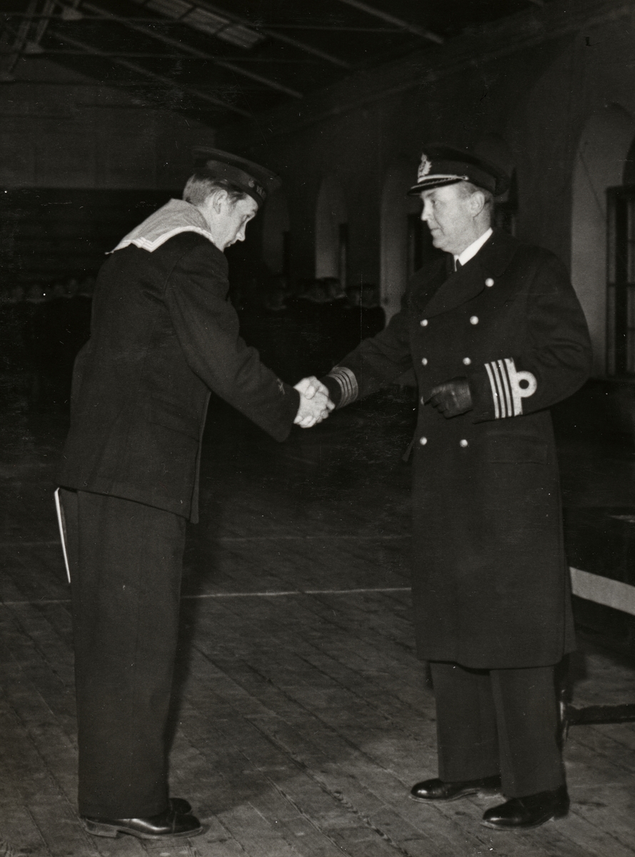 Titel: Sjöman tar kommendör i hand under medaljutdelning.