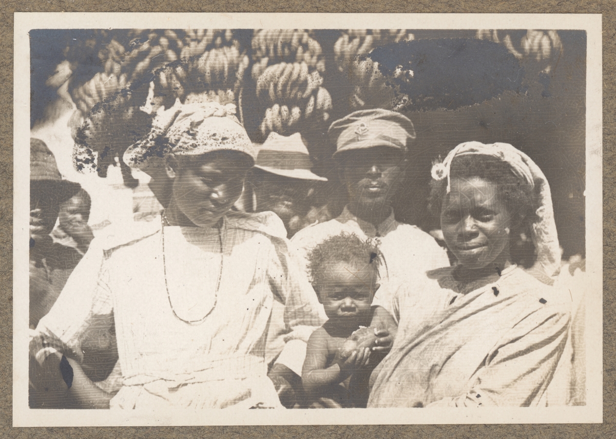 Denna porträtt visar två svarta kvinnor med ett barn som verka äta en frukt. I bakgrund syns flera svarta män och bananer.