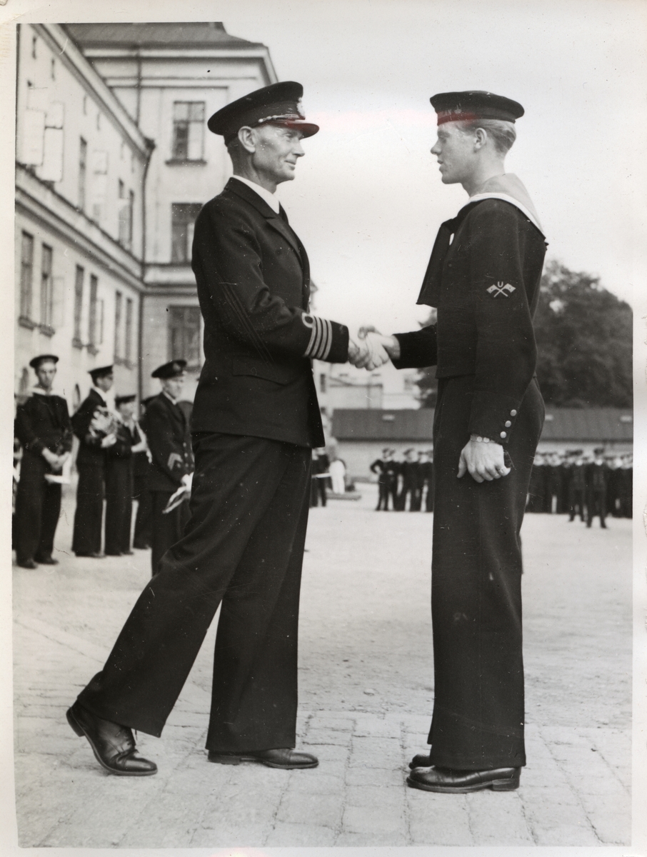 Leende officerare skakar hand med värnpliktig ung man under cermoni och medaljutdelning. I bakgrunden syns övriga befäl och värnpliktiga på rad samt en del av en byggnad.