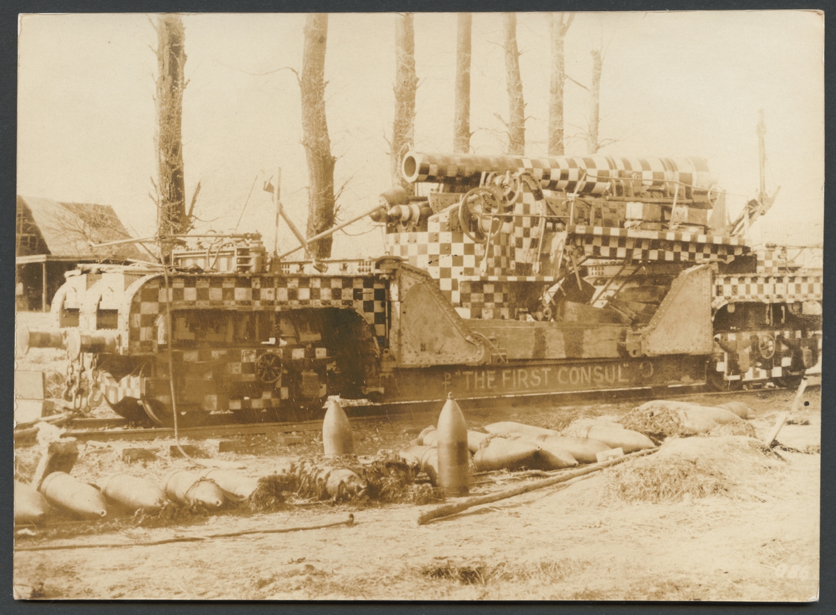 Bilden visar en engelsk järnvägsartilleripjäs med maskeringsmålning. Kanonen är döpt till namnen "The first consul". I förgrunden ligger en rad granater.
