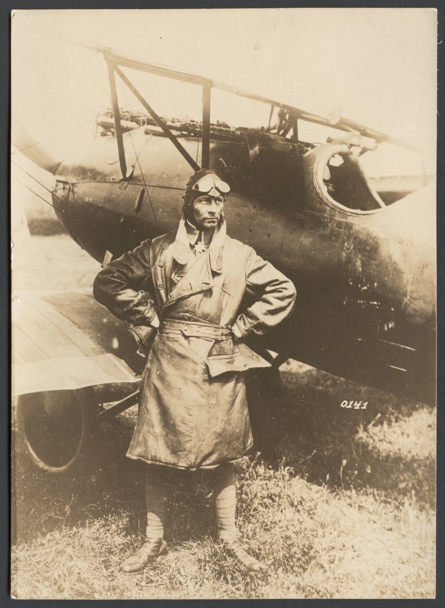 Denna porträtt visar den tyske stridspiloten Eduard von Schleich som poserar i flygdräkt framför sin flygplan Albatros D.V