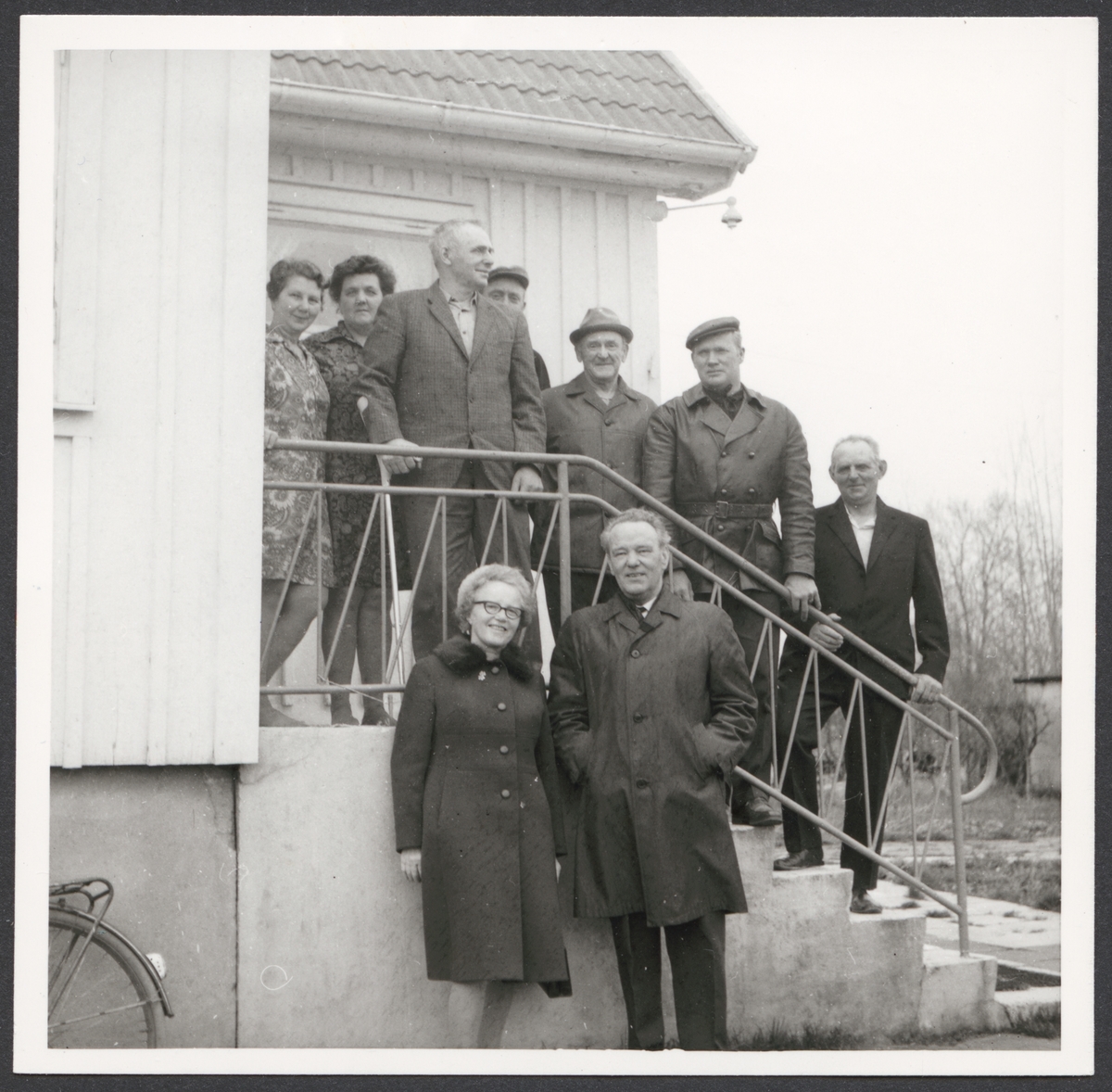 Fotografiet föreställer ett grupporträtt av Vänstanvägs besättning i samband med verksamhet av skeppsgosseföreningen. I centrum står kapten Gösta Aghed och fru Elsa Ehrlin. Dem andra deltagare står på en trappa bakom paret.
