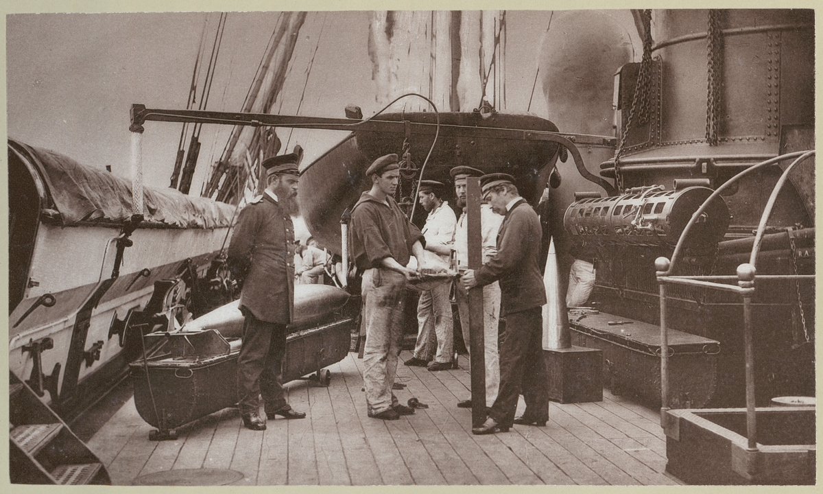 Bilden förställer tyska sjömän ombord på korvetten Stosch som drillas i hanteringen av torpeder på däcket. Här övas hur torpeden ska ställas in inför skjutning.