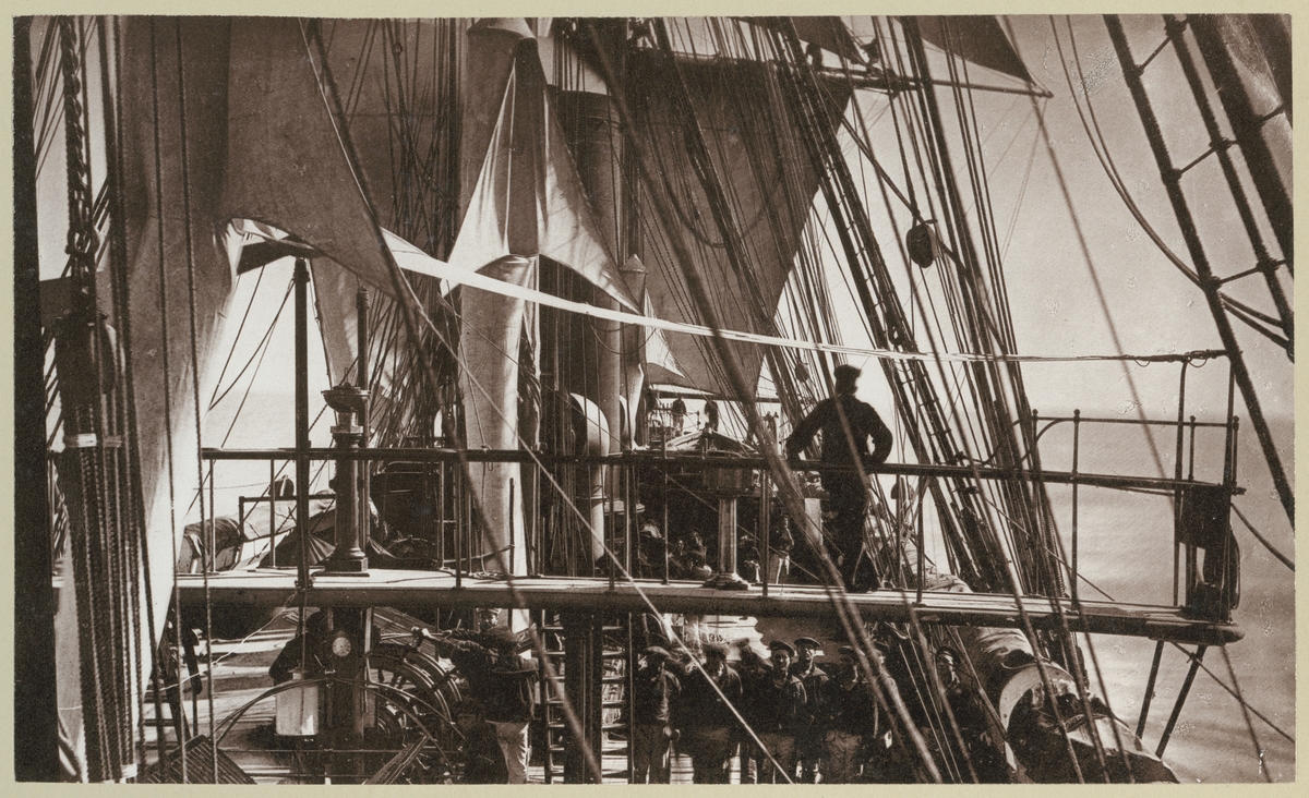 Bilden visar sjömansarbeten i riggen på korvetten Stosch. Seglarna är satta.