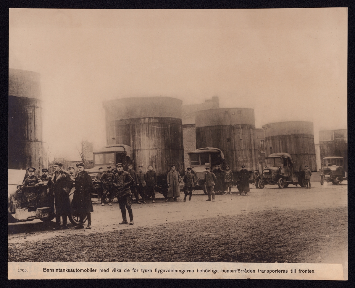 Bilden visar en kolonn med tankbilar samt tillhörande personal som lastbilschaufförer och bevakning. Tankarna är utformad som oljecisterner.