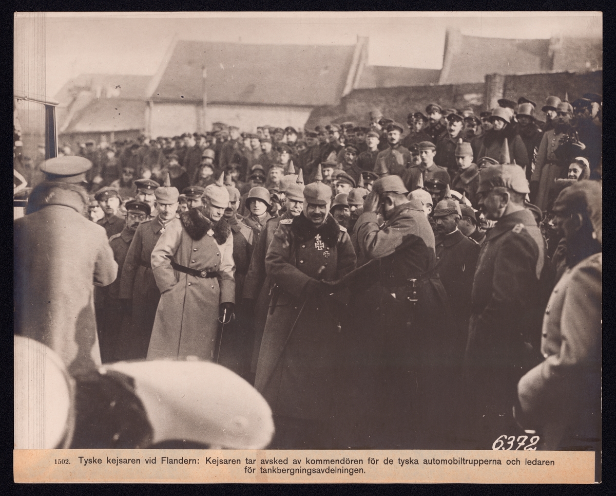 Bilden visar den tyske kejsaren Vilhelm II på ett truppbesök. Han står mitt i en stor åskådarmängd och skakar handen med en officerare. I bakgrunden syns bebyggelse.