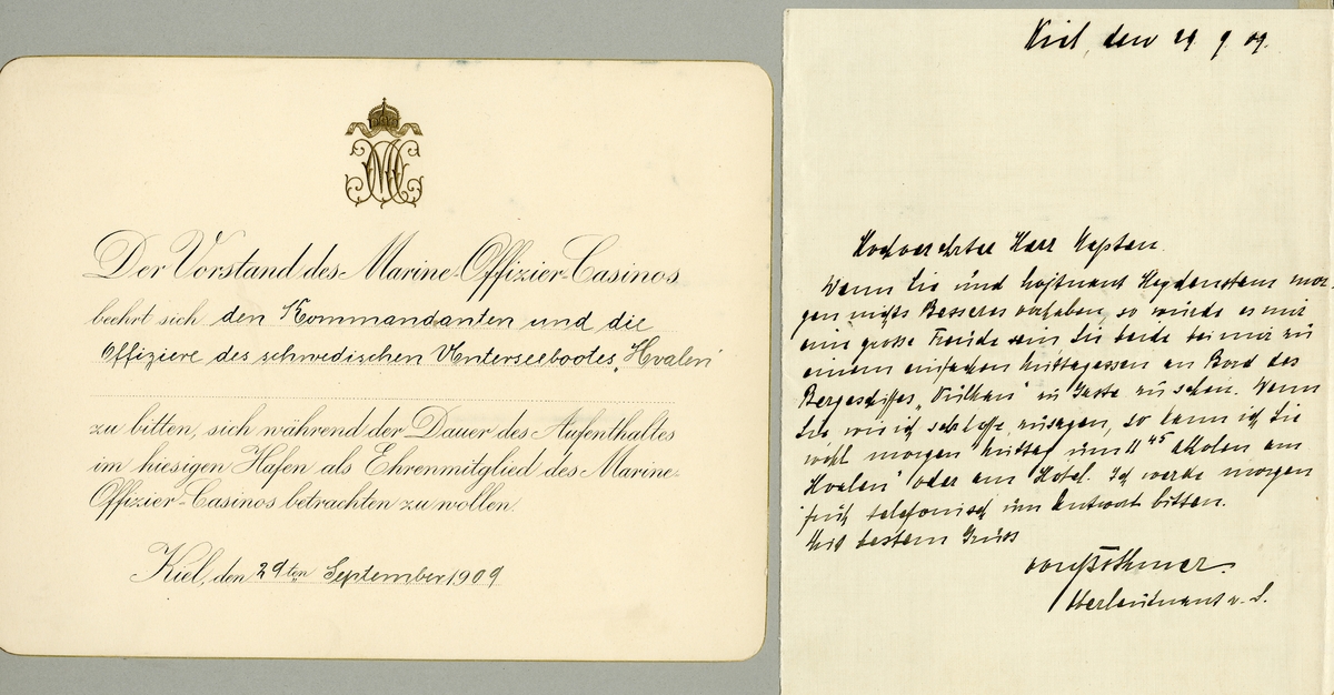 Memorabilia från ubåten HVALENs resa från Italien till Sverige 1909. Inbjudan till sjöofficerskasinot i Kiel.
