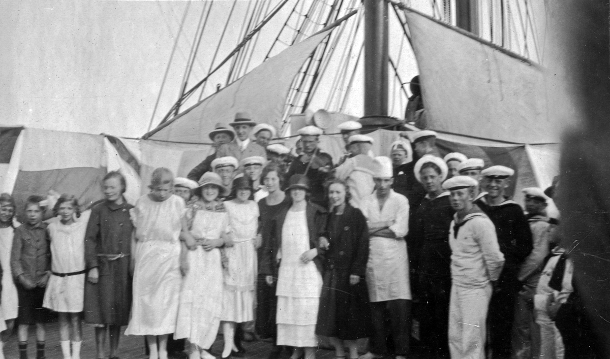 Titel: Fest ombord på Najaden. Matroser och och finklädda flickor/kvinnor.