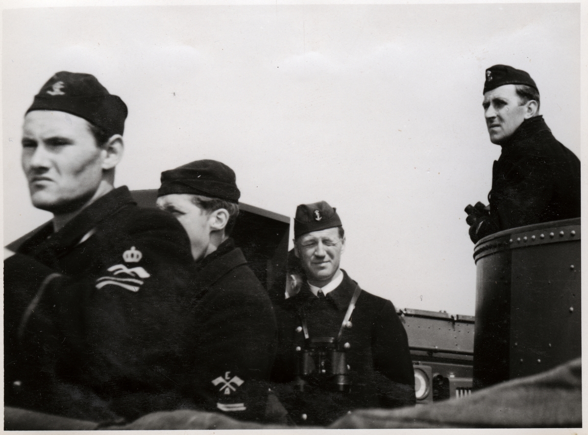 Fyra sjöbefäl blickar ut över havet från fartygsbryggan. Den tredje mannen från vänster står vänd mot fotografen och kisar mot solen. Alla bär båtmansmössor med tillhörande uniform samt kikare.