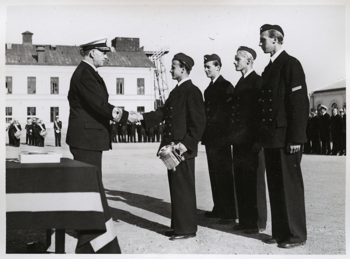 Centralt i bilden ses viceamiral Fabian Tamm skaka hand med en ung man som håller en pokal i handen. I anslutning till dessa två står också tre unga män uppradade. Enligt gradbeteckningen på deras ärmar är de förordnade till furirer (skoltecken; kadetter med underbefälsgrad).
