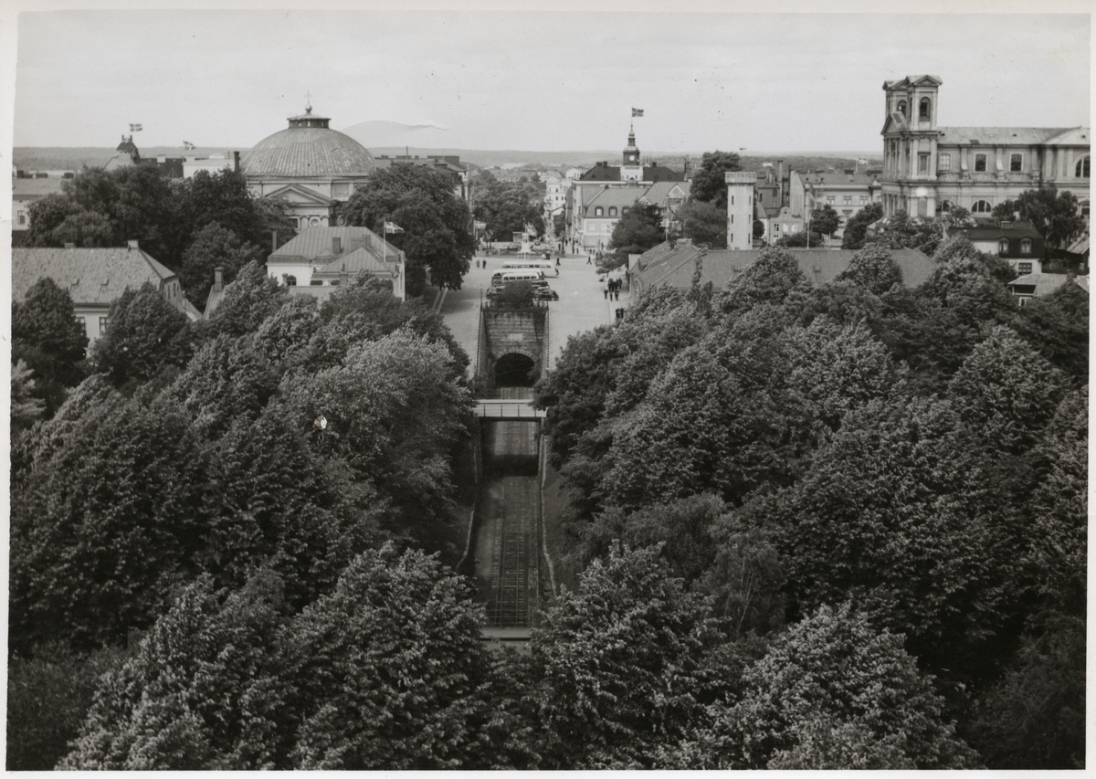 Stadsvy av Karlskrona centrum, tågtunneln uppmot torget. Bilden visar även natur och kyrkornas tak och i förgrunden diverse trädkronor. Fotot taget högt uppifrån.