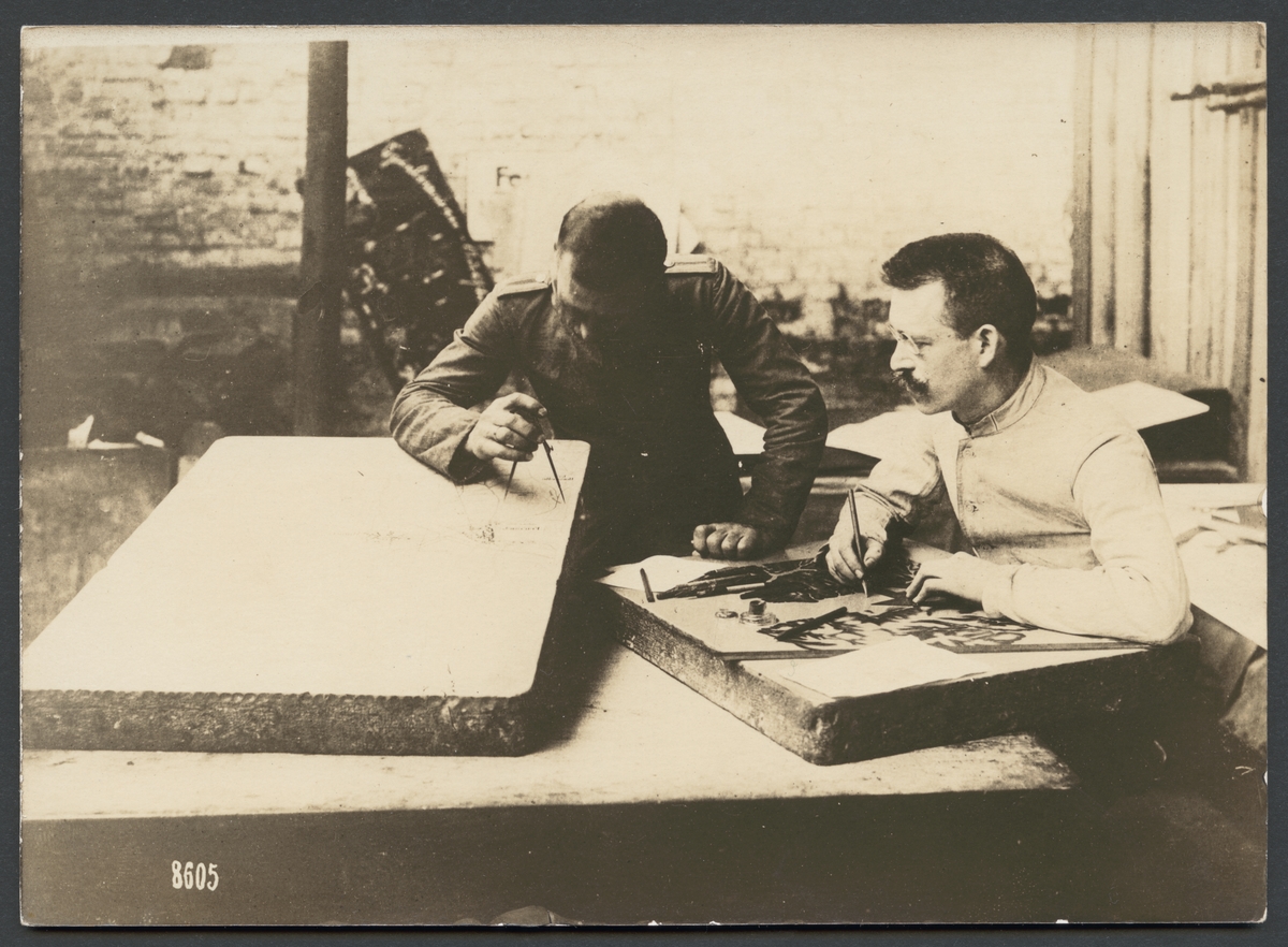 Titel: Bilden visar två kartografer som håller på att rita kartor på tjocka plattor av kalksten.