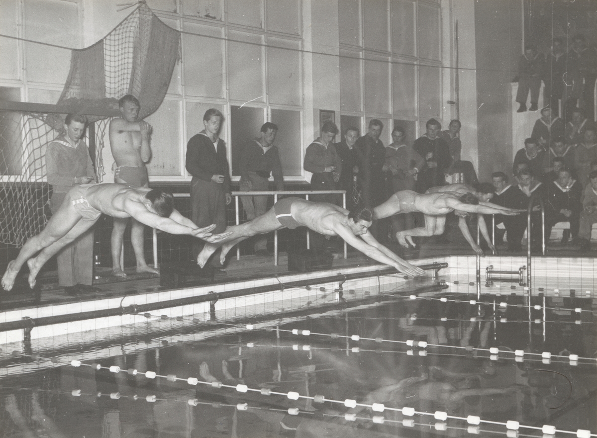 Titel: Flera unga män dyker från bassängkant och tävlar i simning.