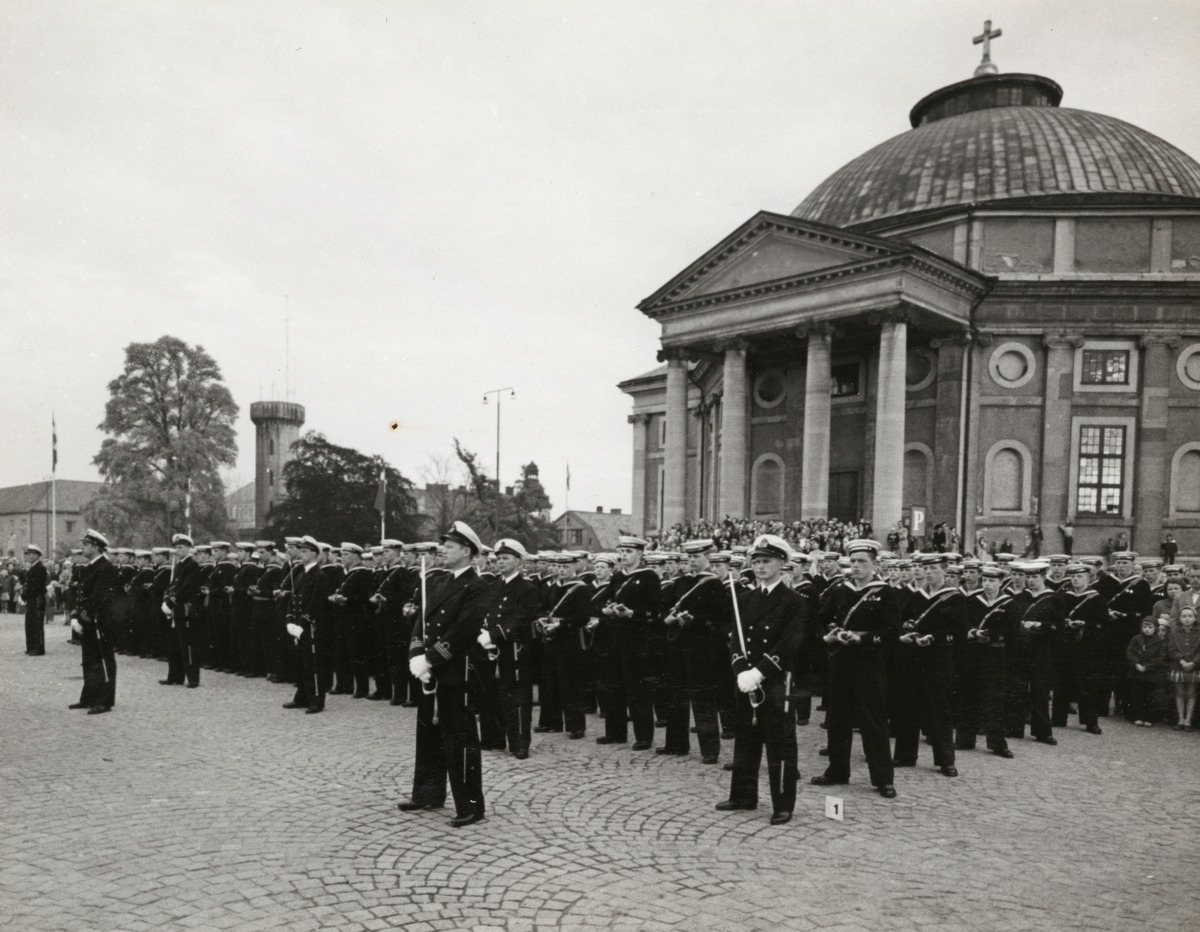 Titel: Marinens militärer poserar framför Tyska kyrkan. Matroserna bär eldvapen och sjöbefälen värjor.