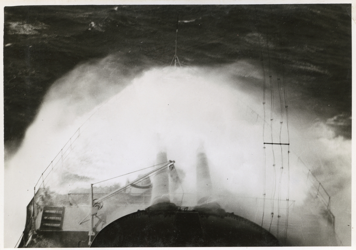 Fotot visar en fartygsför där en vattenkaskad täcker däcket. I bild syns också en del av kanonerna på däck. Bilden är tagen uppifrån en högre punkt på fartyget.