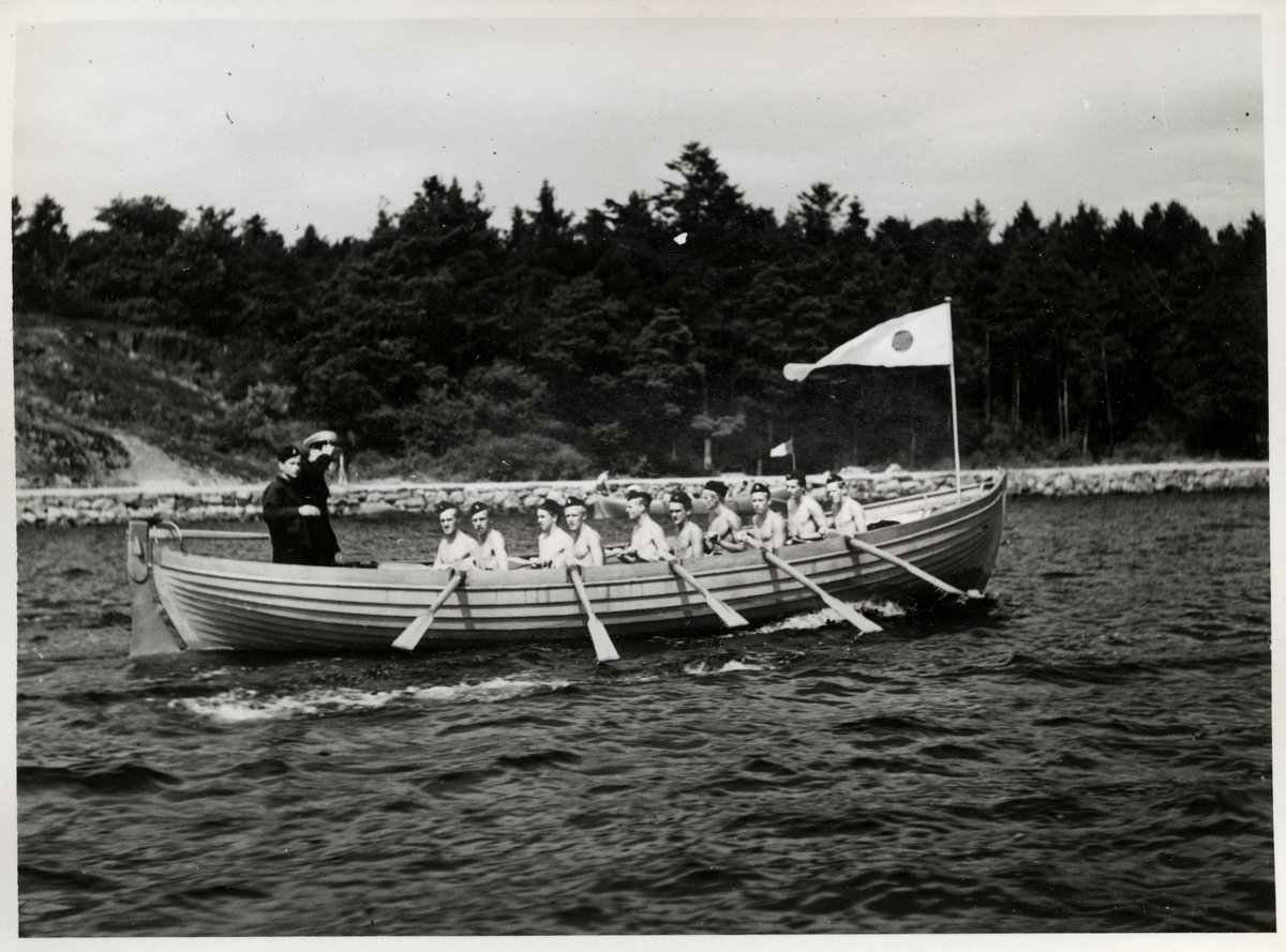 En roddbåt med ett roddarlag. Kapten och en ung man står i aktern och gör honör. I fören vajar en vimpel.