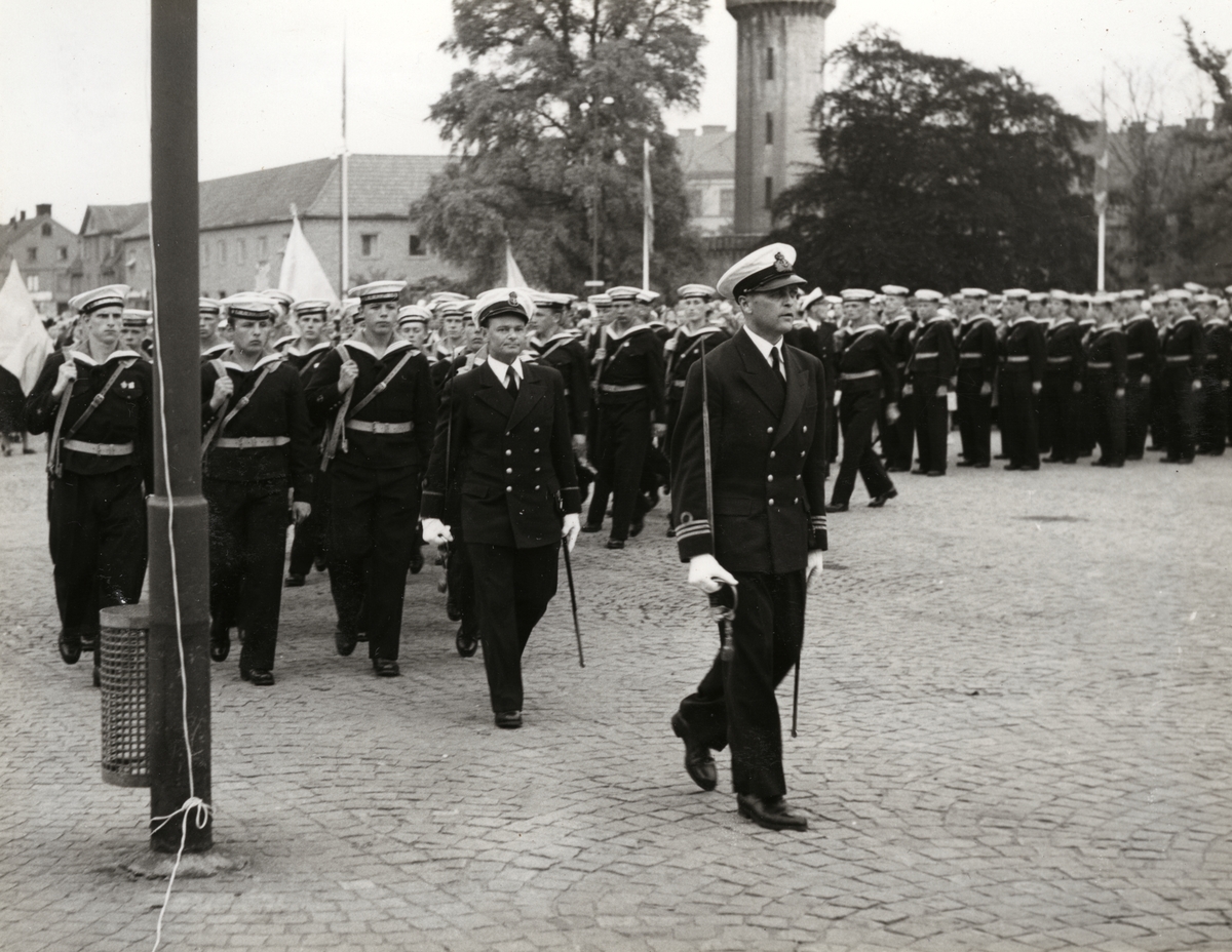 Titel: Flottans militärer med sjöbefäl marcherar runt på stortorget. I bakgrunden syns vattentornet.
