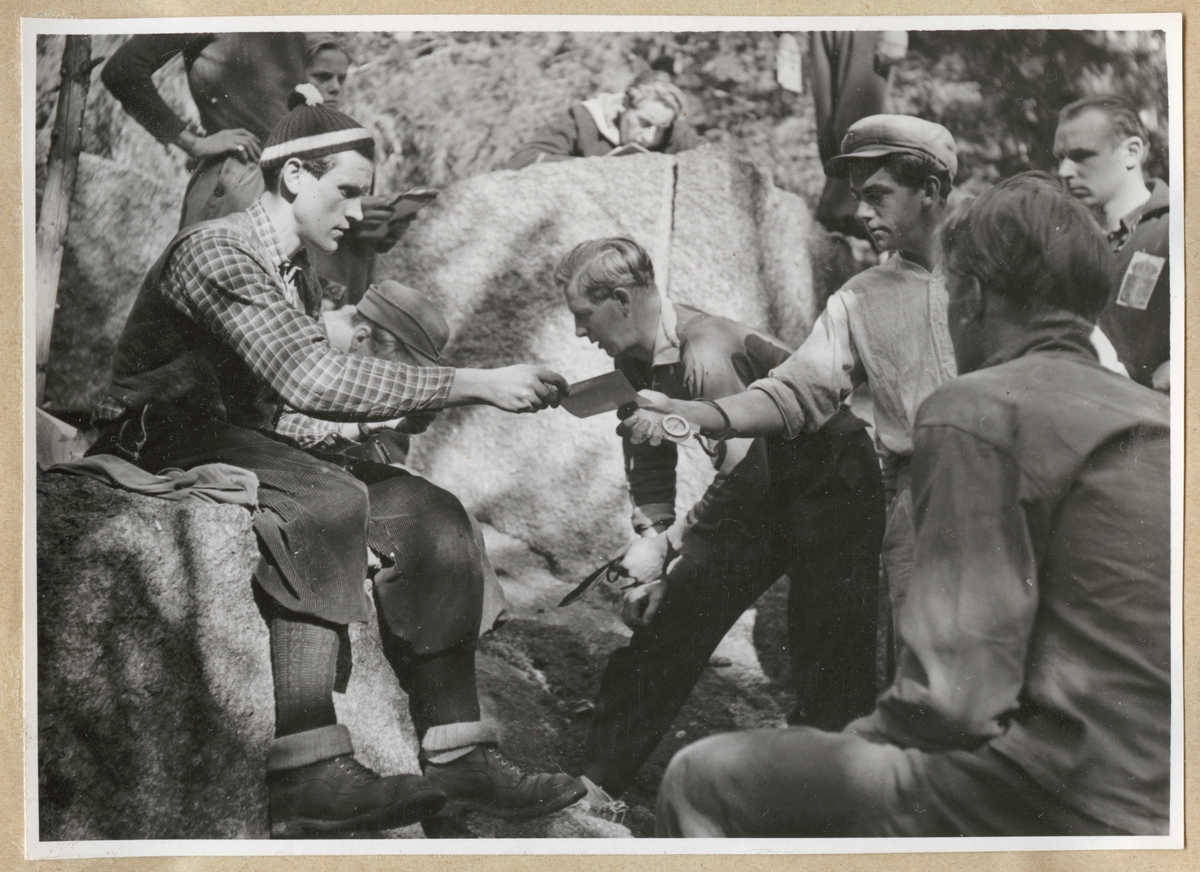 Ledigt klädda män sitter tillsammans mellan stenblock. En av dem passar vidare en lapp till en annan, han håller även i en kompass. I bakgrunden syns en av männen se in i ett papper. En av männen i gruppen har sveriges statsvapen på sin jacka.