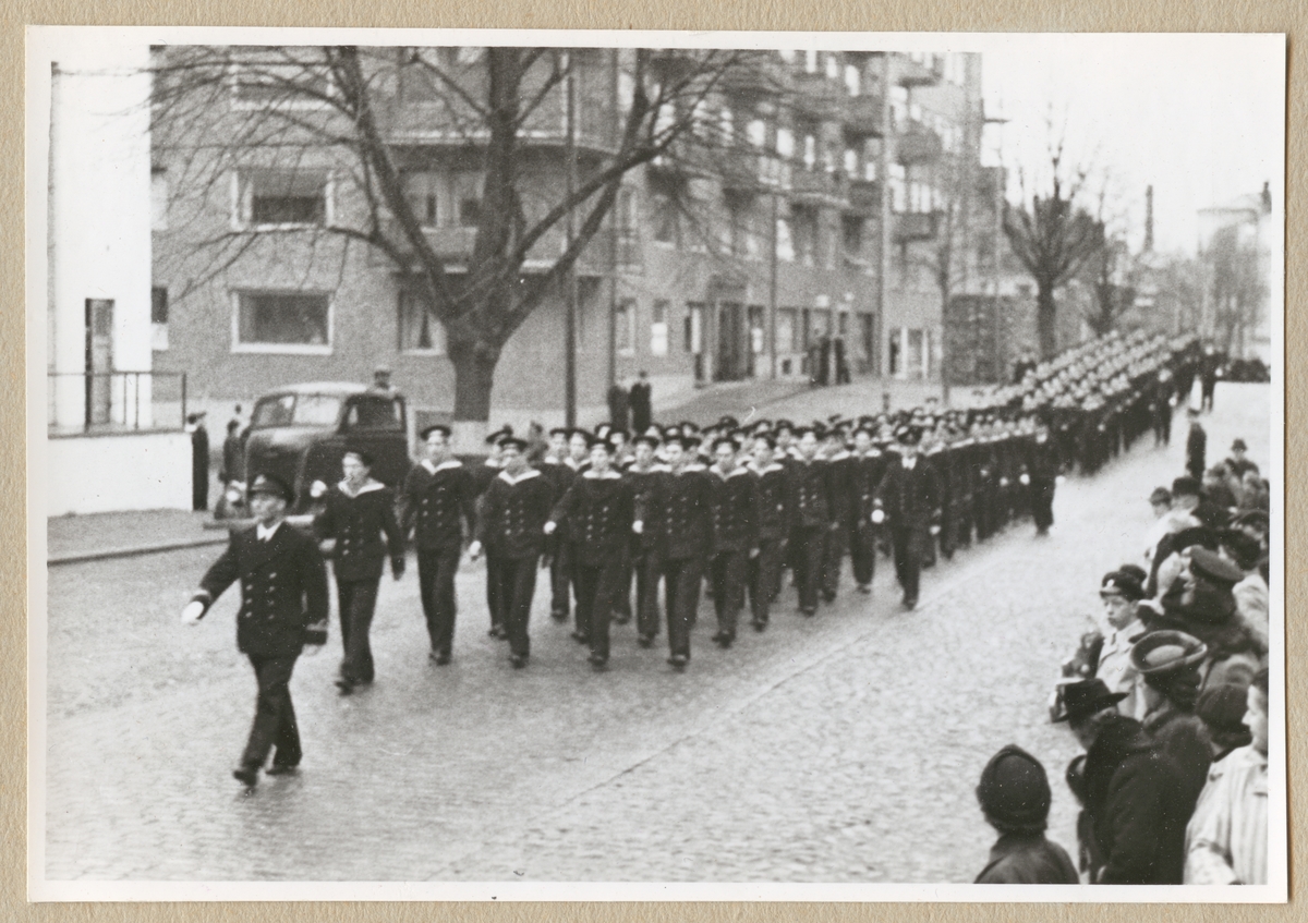 Uniformsklädda flottister marscherar längs med Drottningsgatan i Karlskrona. Längs med den stenbelagda gatan står även civila åskådare. Gatan kantas av flerbostadshus med utstickande balkonger. På gatan syns även ett parkerat motorfordon.