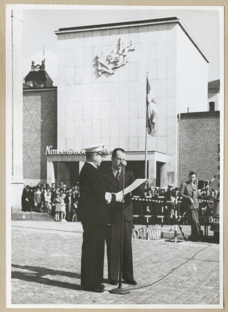 Konteramiral Ehrensvärd står tillsammans med en man, klädd i kostym, framför ett stativ med en mikrofon på Stortorget i Karlskrona. I bakgrunden syns en folksamling stå framför konserthusteatern. Framför konserthusteatern finns även en flaggstång med en svensk flagga hissad.