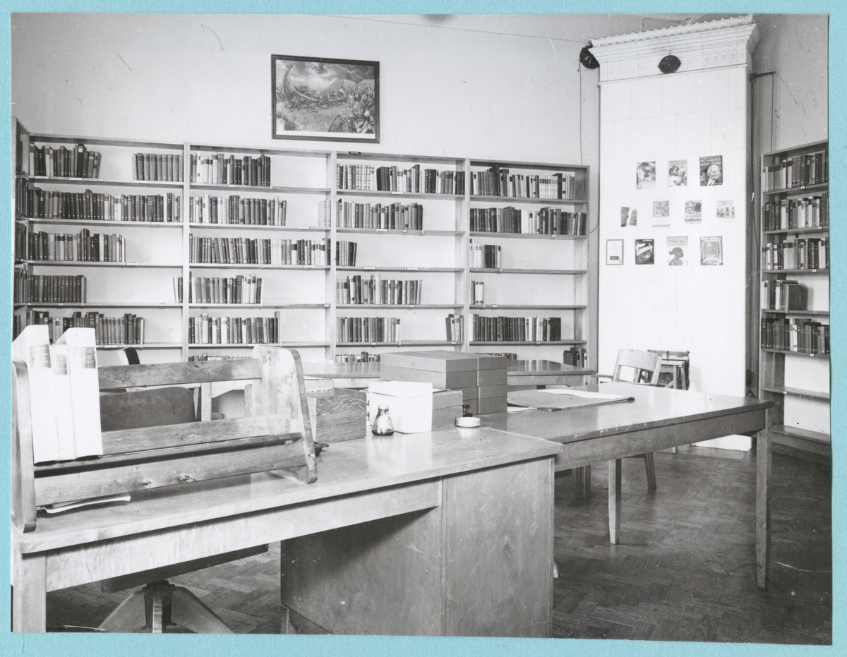 Interiör av ett biblioteksrum. Längs väggar står bokhyllor av trä uppradade och fyllda med böcker. Ovanför dessa hänger en tavla på ena väggen. I hörnet av rummet står en kakelugn. I mitten står skrivbord och stolar med kartonger på. Fotot är daterat 25-2-52.