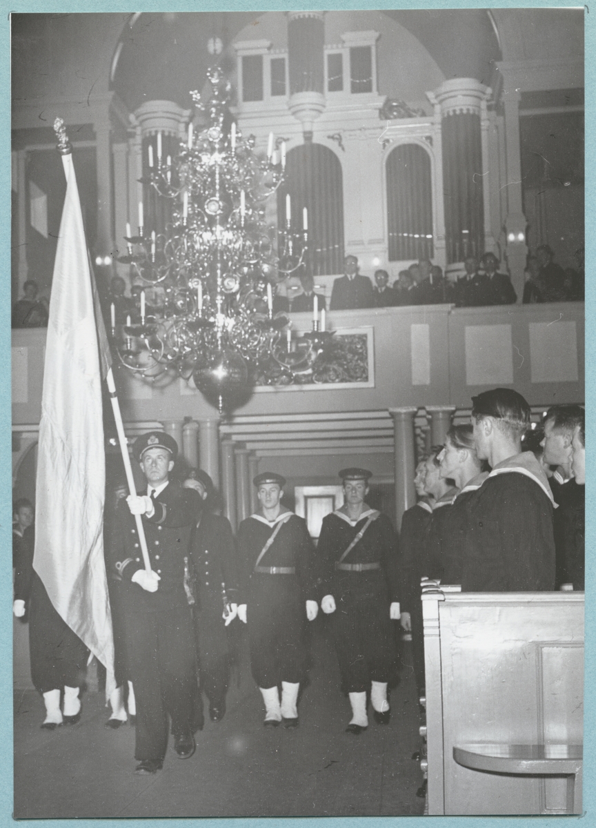 Bilder från Krigsmans erindran den 13/10 1951. Uniformsklädda flottister går genom Amiralitetskyrkans mittgång, över vilken det hänger en ljuskrona i mässing. Längst fram går en löjtnant som håller i en flagga. I bänkraderna syns ytterligare flottister stå upp. I bakgrunden syns kyrkans orgelläktare som bärs upp av doriska kolonner. På läktaren, framför orgelfasaden, står flera män.