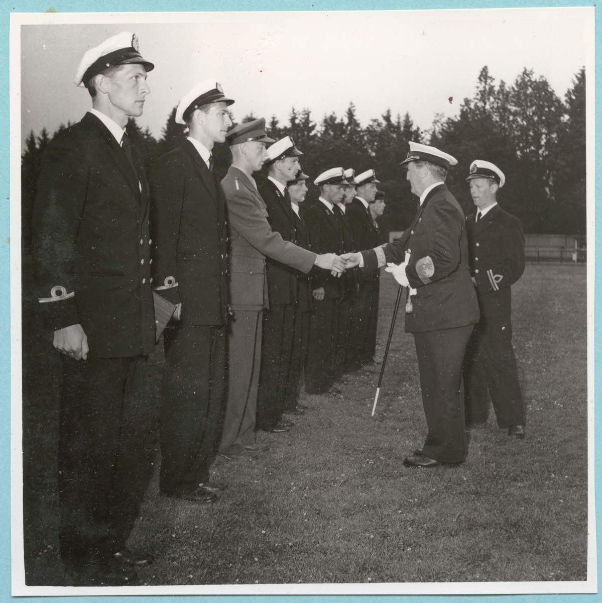 Unga militärer står på rad medan konteramiral Samuelson sträcker fram handen och tar i hand med en av de yngre militärerna. Bakom Samuelson står en löjtnant från amfibiekåren. Samtliga är klädda i uniformer.