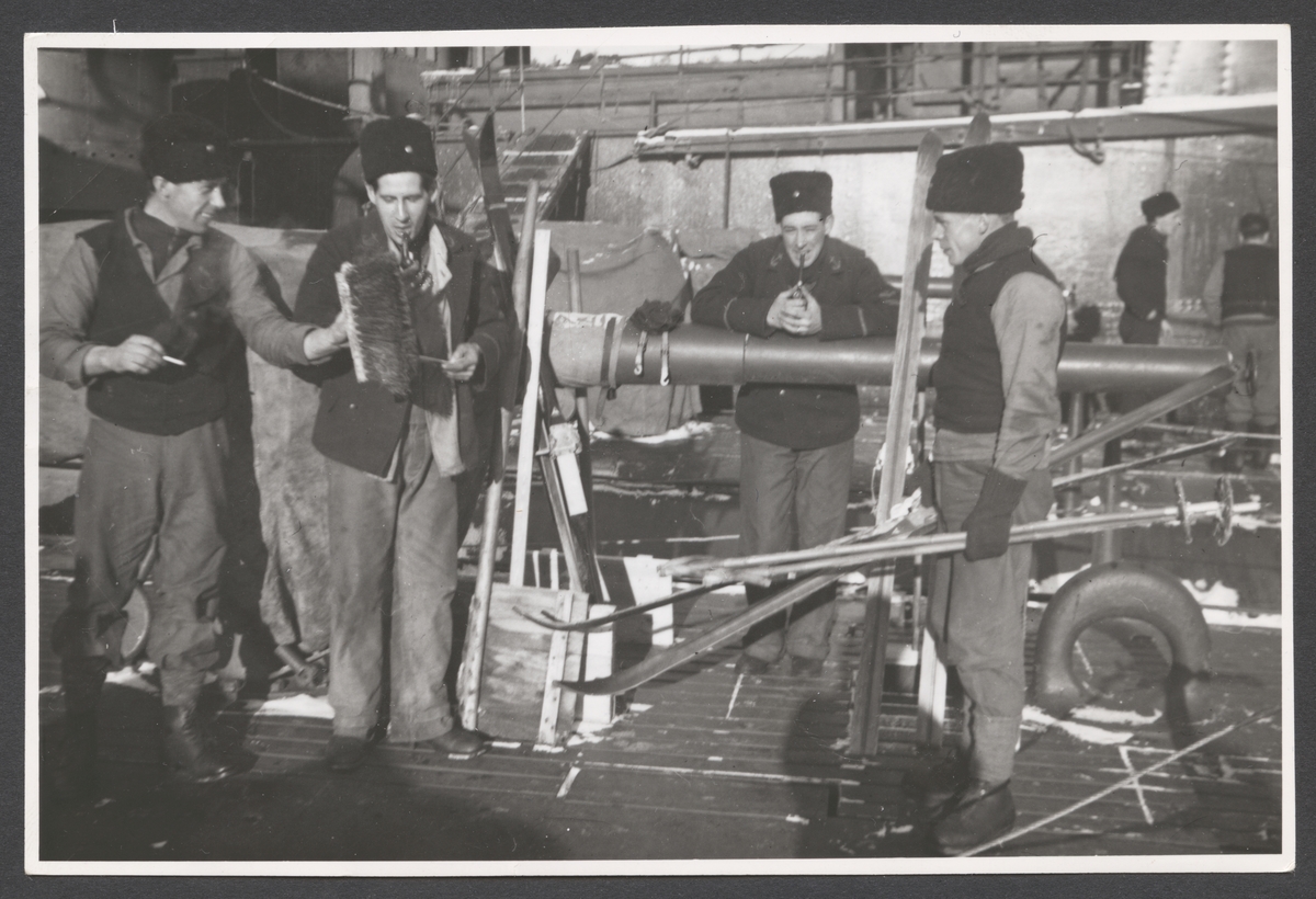 Bilden visar en grupp besättningsmän på däck av ett örlogsfartyg som verka har fritid. Stämningen bland de fyra unga män är avslappnad. I centrum står förmodligen Evert Ingemansson som stödjer sig på ett eldrör och röker pipa. På hans höger sida syns två kamrater som också röker och verka göra en skämt med en kvast. Fjärde mannen på Ingemanssons vänster sida är på väg att åker skidor. All fyra bär arbetskläder och vintermössor.