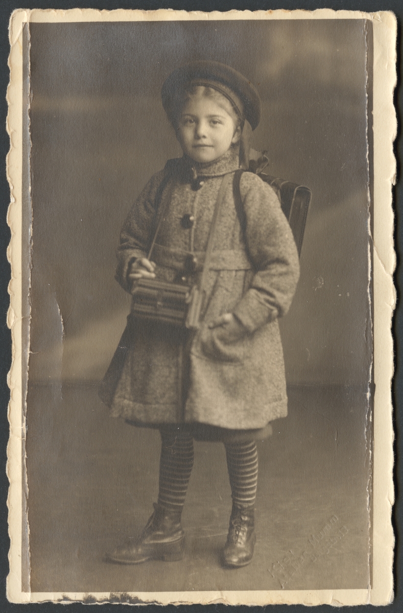 Poträttfotografin förställer Heide Lembke som skolbarn. Hon är klädd i en vinterkappan, mössa, lädersko och randiga strumpor. På ryggen bär hon en skolväska och runt halsen en väska för matsäcken.