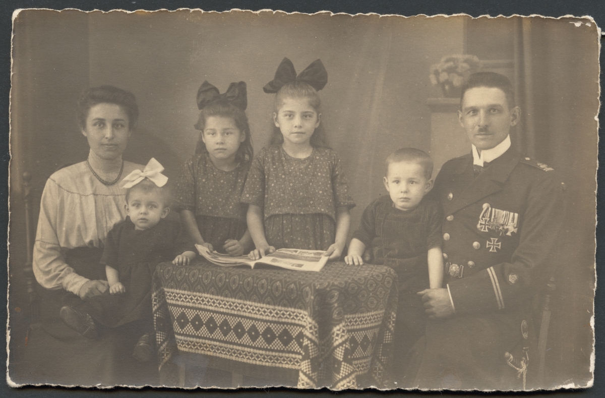 Denna ateljéfotografi föreställer familjen till den tyske sjöofficeraren Fritz Lembke. Fotografen har arrangerat familjen runt ett bord. Båda föräldrar sitter på en stol och har varsitt barn på knäet. De två stora döttrar står vid bordet och har en tidskrift framför sig. Pappan bär uniformen av den tyske marinen som är prydd med flera utmärkelser och medaljer, bland annat två järnkors.