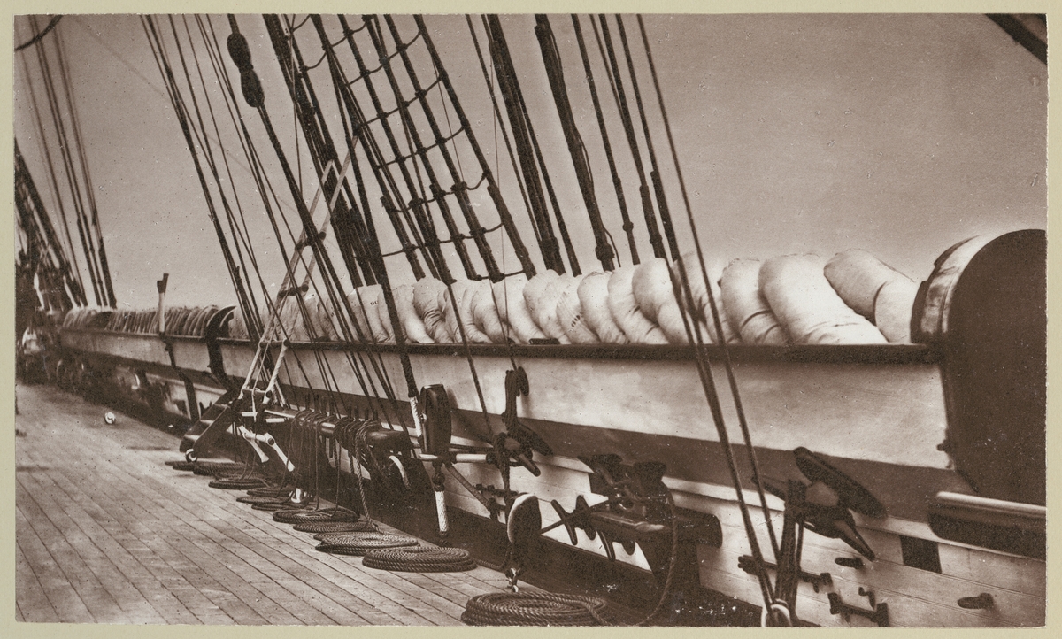 Bilden visar förvaringen av hängmattor på relingen av korvetten Stosch.