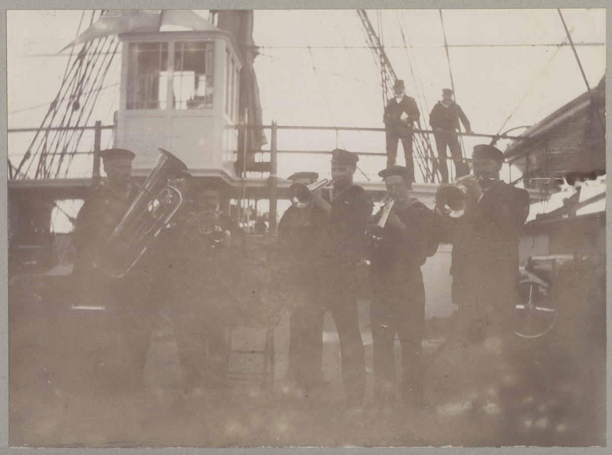 Titel: Balders musikkapell spelar ombord. I bakgrunden syns kommandobryggan.