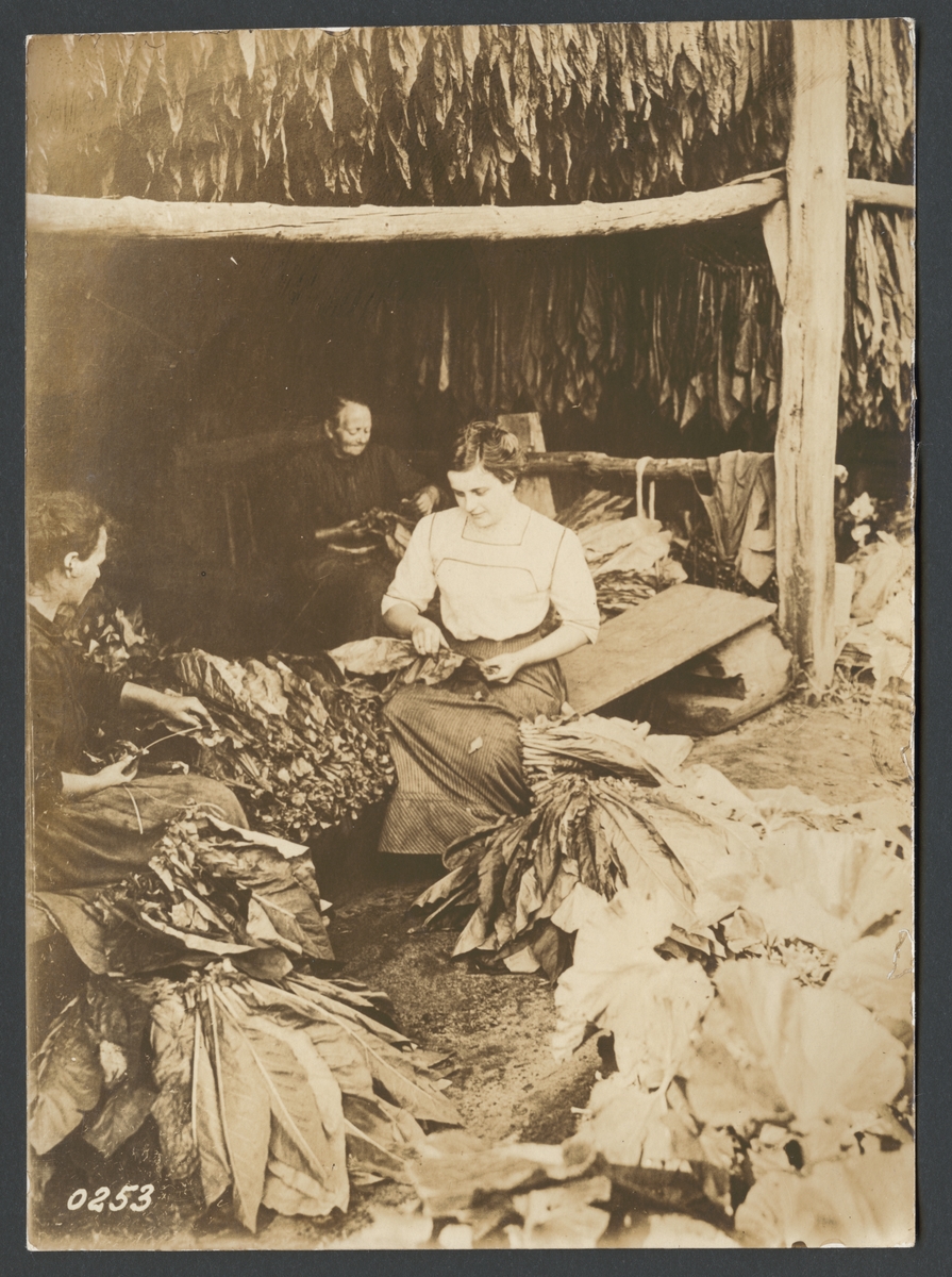 Titel: Bilden visar tre kvinnor som förbereder tobaksblad för torkning genom att dra de på ett snöre.