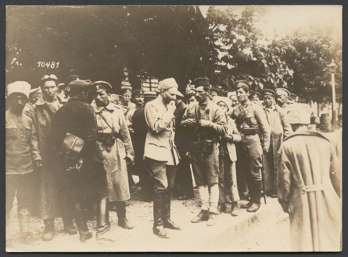 Titel: Bilden visar en större grupp uniformerade män med gevär och pälsmössor i samtal.