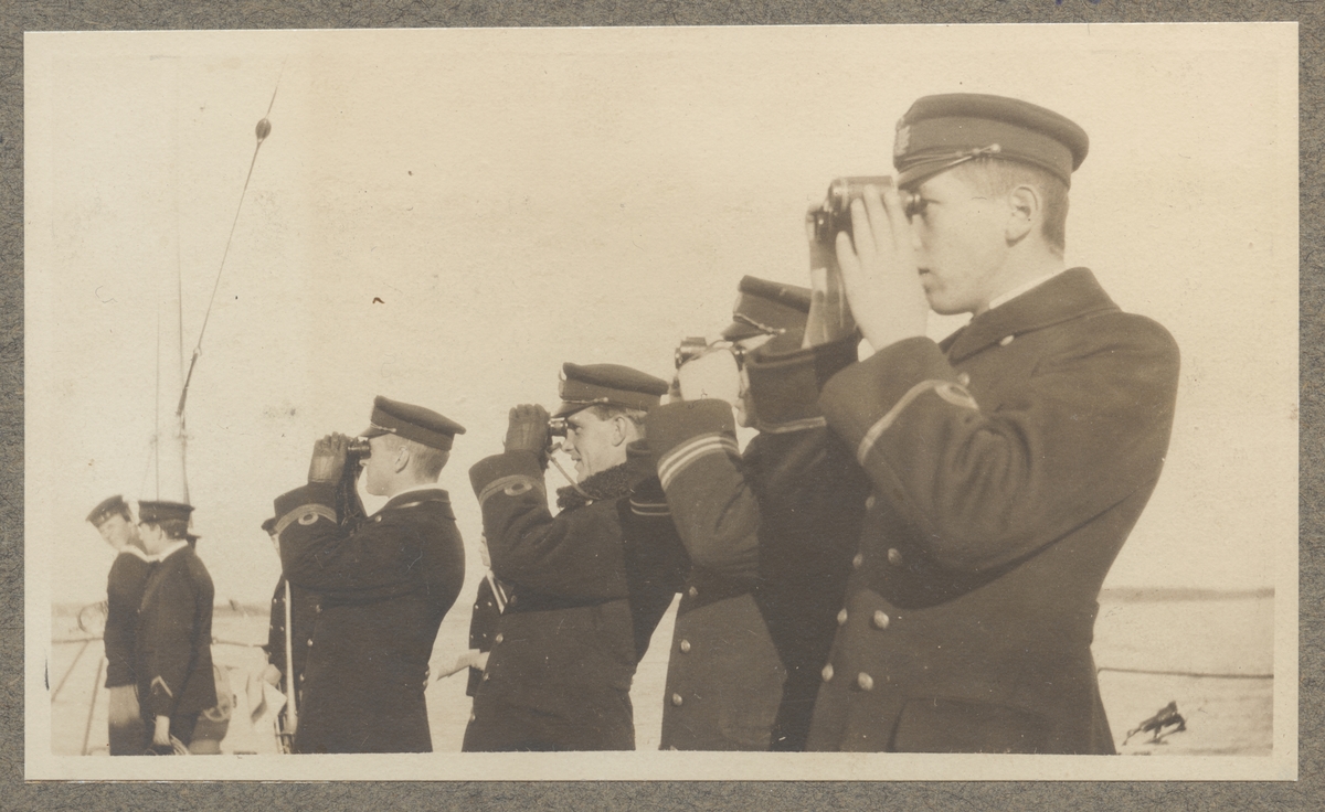 Titel: Bilden visar en rad befäl ombord på Fylgia som tittar i fjärran med kikare.