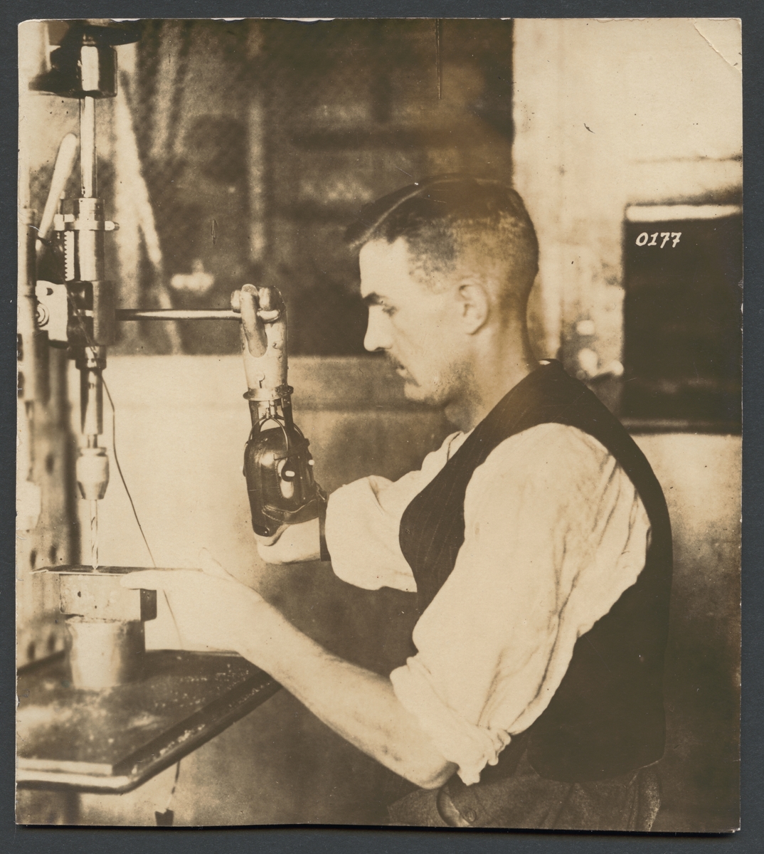 Bilden visar en krigsinvalid med armprotes, en så kallad "Sauerbrucharm", som arbetar med en borrmaskin.