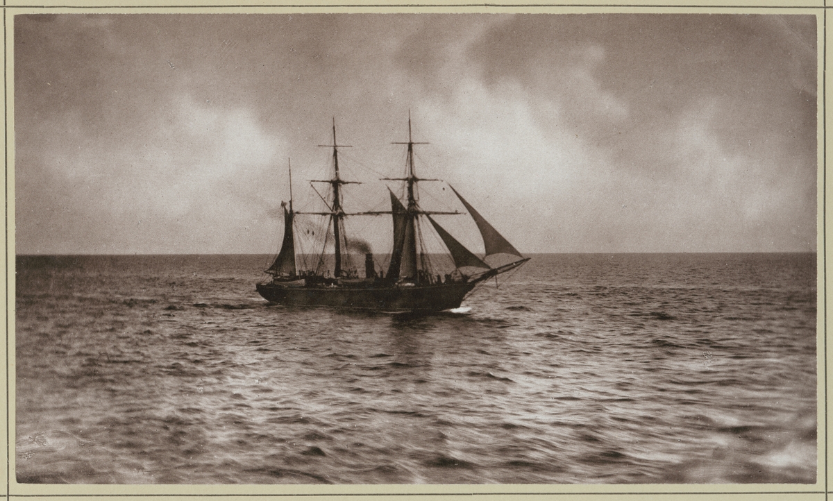 Bilden visar den tyska kanonbåten Iltis som genomför seglingsmanöver till havs. Ångfartyget är riggat som barkentine. På grund av motvind kan den inte sätta råsegel utan gå på ångmaskin och snedsegel.