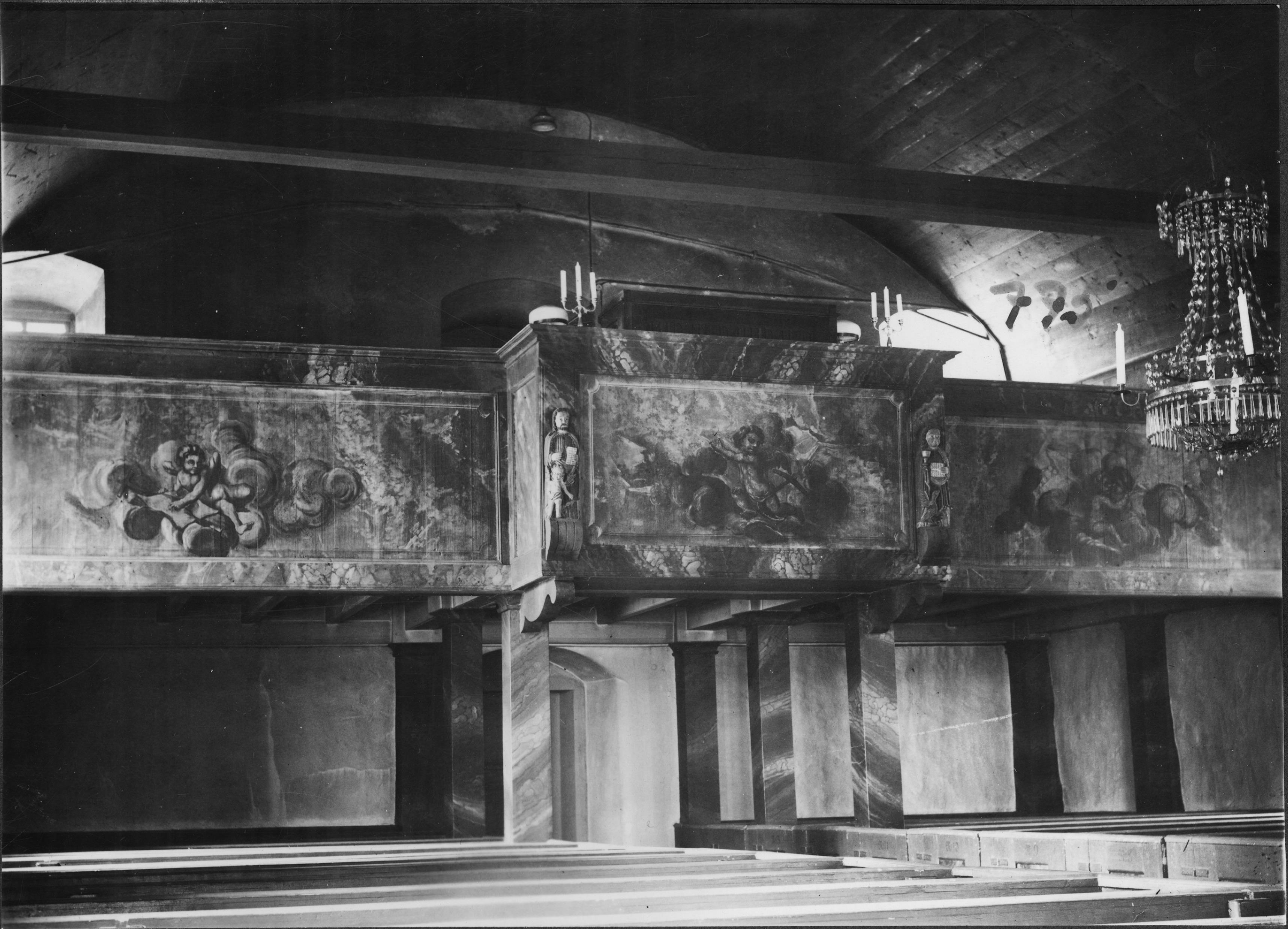 Läktarskrank, målat (putti med Trons, Hoppets och Kärlekens symboler). Snabbinv.