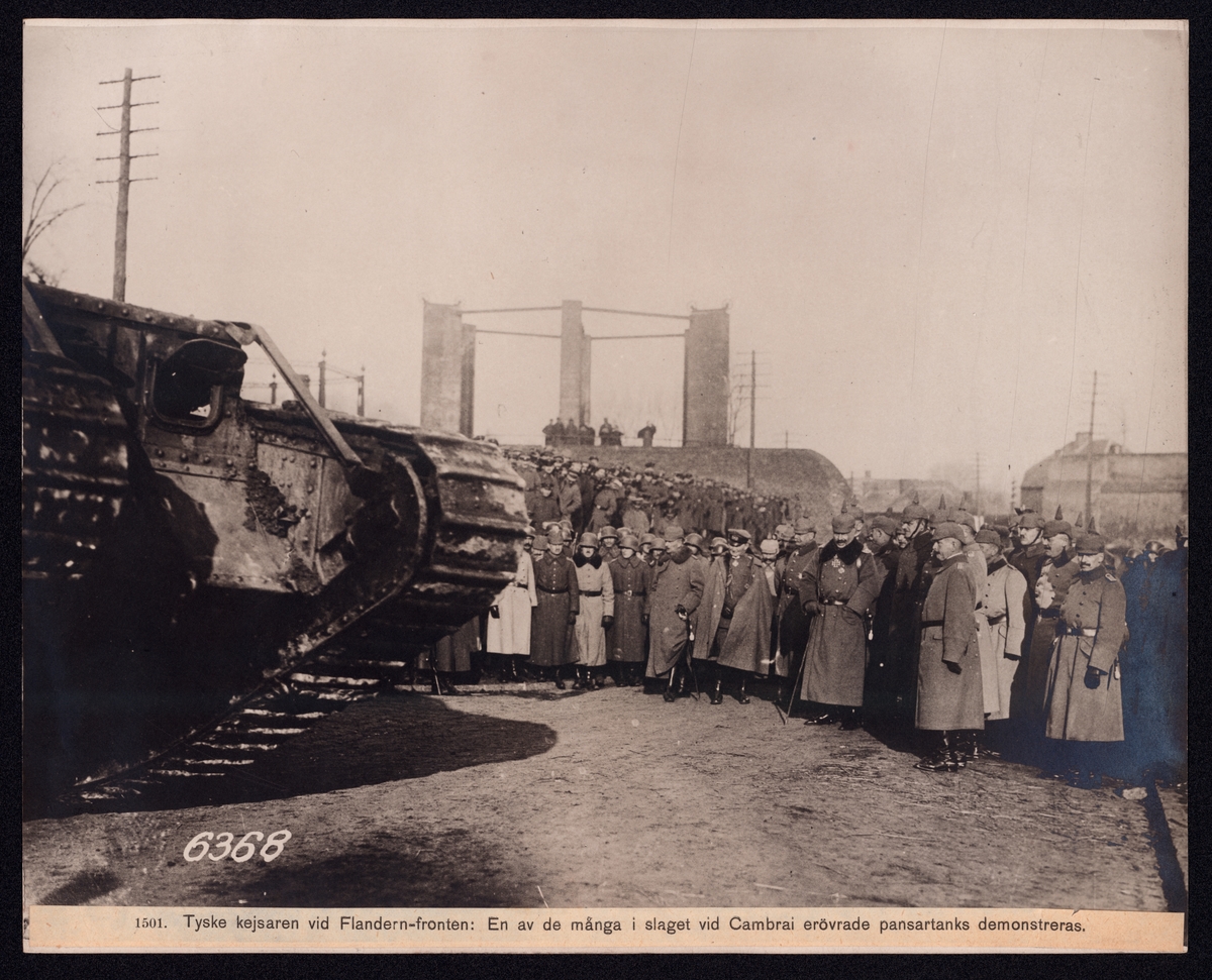 Bilden visar den tyske kejsaren Vilhelm II på en trupbesök i Frankrike. Han beskådar en engels stridsvagn omringad av en stor åskådarmassa.