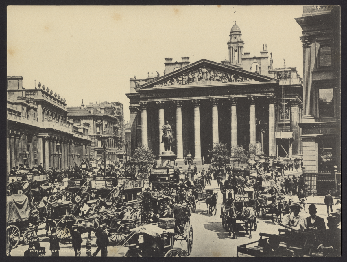 Titel: Bilden visar livlig trafik med hästfordon i London framför börsbyggnaden.