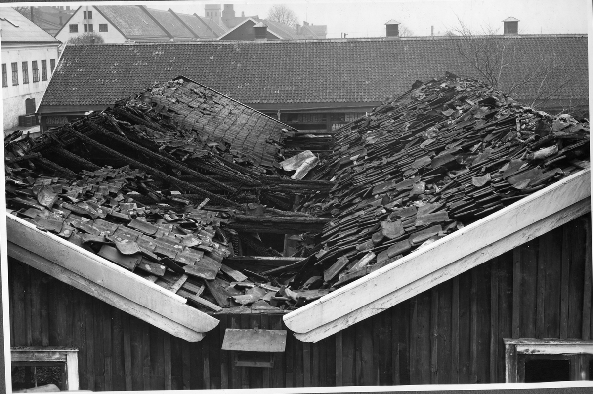 Titel: Bilden visar brandskador på taket av två virkeskjul som låg bredvid bildhuggareverkstaden.