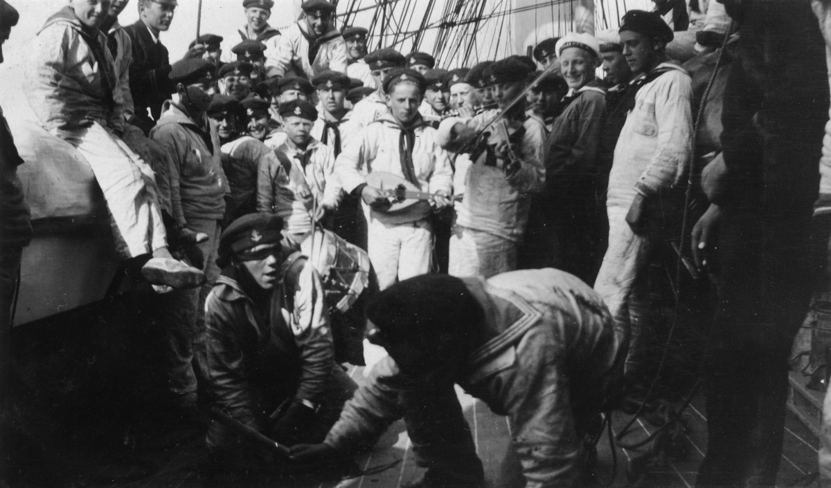 Titel: Besättningen rengör fartygsdäck. Vatten öses från hinkar.