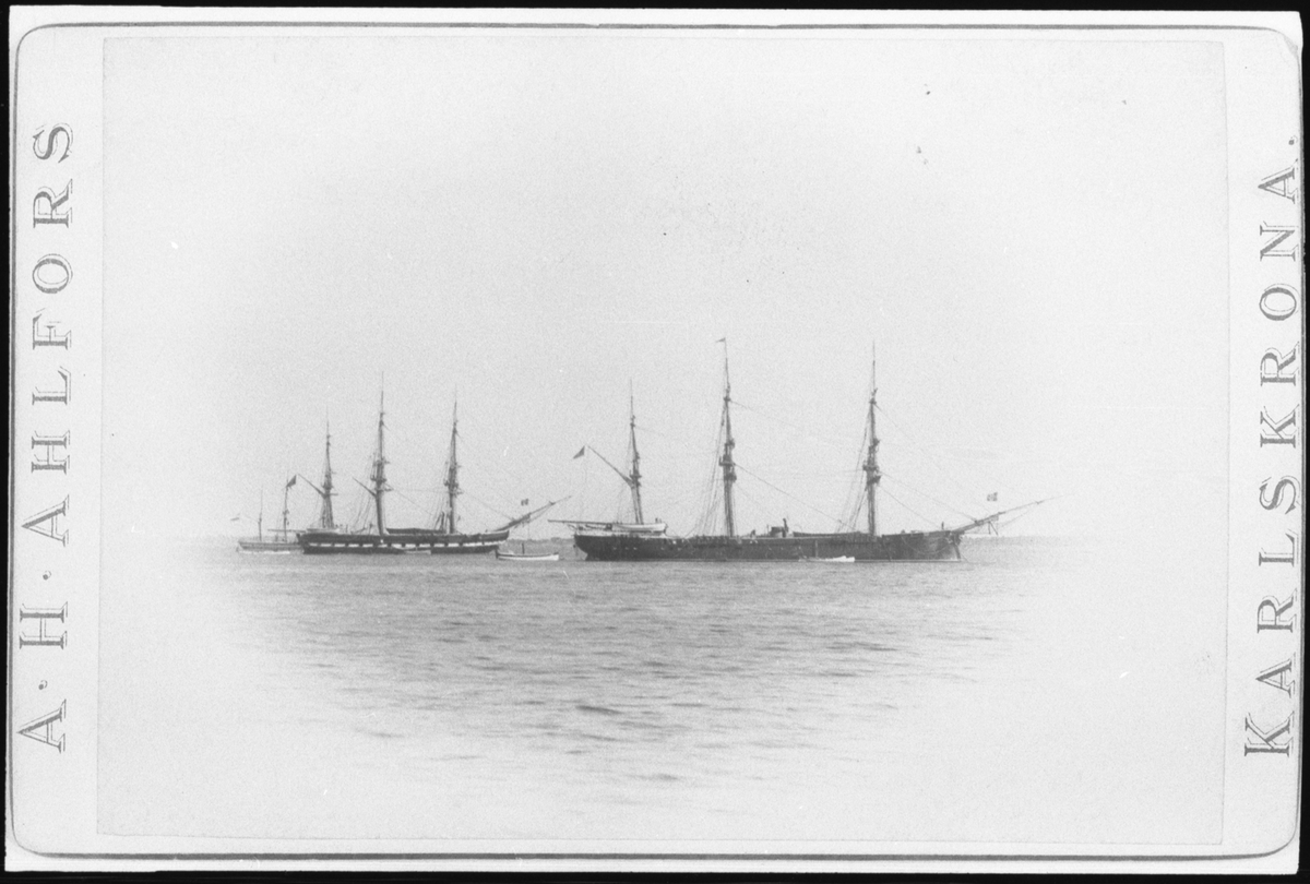 Reprofotografi efter ett vykort som visar fregatten Norrköping och korvetten Saga som ankrar i Karlskrona. Vänster om Norrköping ligger en tredje segelfartyg. Före skeppen syns flera mindre roddbåtar.