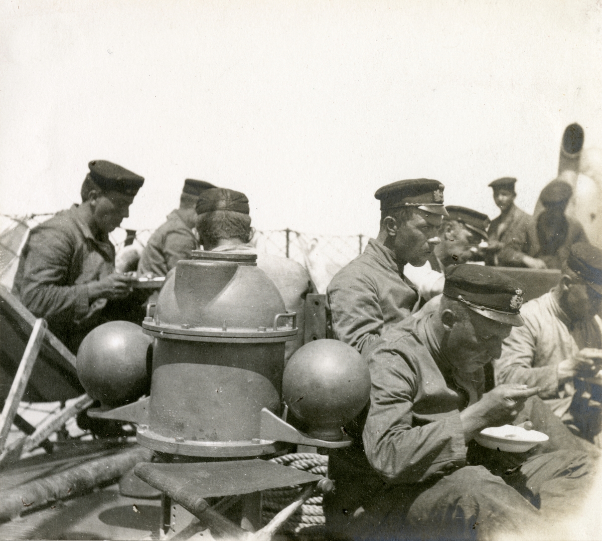 Titel: Skaffning på däck ombord ubåten HVALEN. I förgrunden syns nakterhuset.